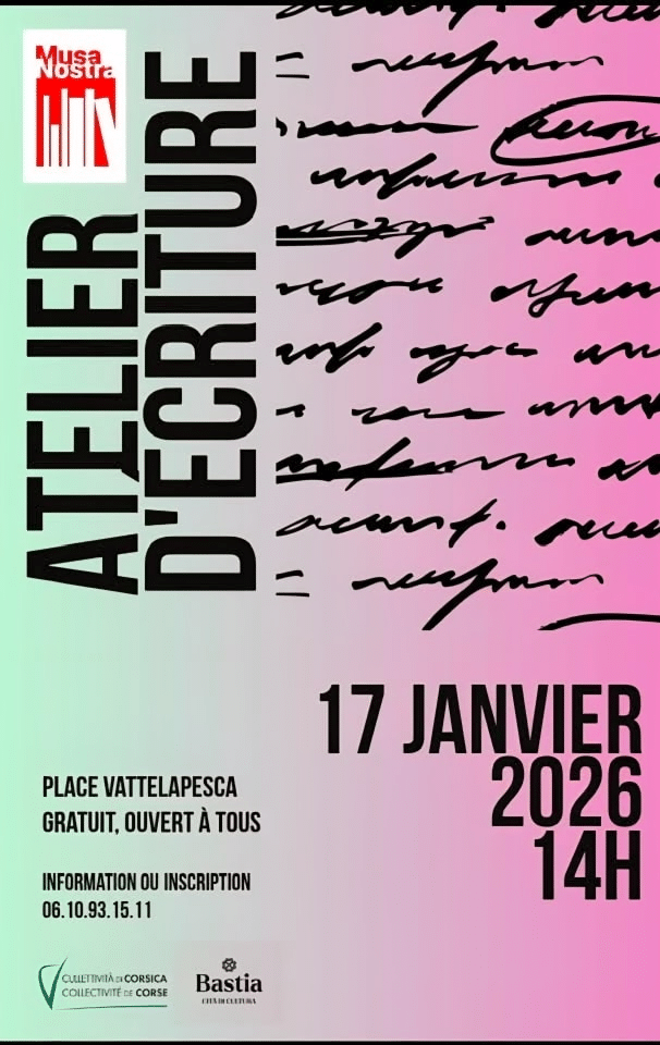 Atelier d’écriture trimestriel, bilingue français-corse, animé par Marie-Lou Volpei de l’association Bastia Envol en lien avec les thématiques des conférences proposées par la Médiathèque du Centre-ville.