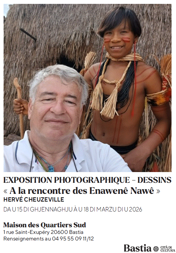 Qui n’a pas joué aux Cowboys et aux Indiens étant petit ? Hervé Cheuzeville, un habitant des quartiers sud de Bastia, a attendu d’avoir la soixantaine avant d’aller chez les « Indiens » d’Amérique. En effet, en janvier 2025, il a eu la chance d’être accueilli chez les ENAWENÊ NAWÊ, un petit peuple autochtone de la grande forêt amazonienne du Brésil. Durant ce séjour, il a partagé le quotidien de ces Amérindiens, dormant dans l’une de leurs malocas (immenses huttes) et enseignant aux enfants et adolescents du village pendant la journée. Il a aussi assisté à de nombreux et interminables rituels pour les esprits, ceux du monde céleste et ceux du monde sous-terrain. De cette expérience unique et plutôt originale, il a tiré un livre, « À la rencontre des Enawenê Nawê – Voyage humanitaire au Mato Grosso » (Éditions Maïa, 2025), et des centaines de photographies. Il en a sélectionné quelques-unes afin de faire découvrir aux visiteurs de cette exposition un monde bien différent du leur et de leur faire connaître des hommes, des femmes et des enfants à la forte personnalité et d’une grande gentillesse, très attachés à leurs traditions ancestrales et à leur mode de vie. Ces photos montrent des « Indiens » bien éloignés des clichés hollywoodiens