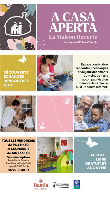La maison ouverte (Lieu d’Accueil Enfant Parent) vous accueille tous les vendredis matins de 9h à 11h30 et les mardis après-midi de 14h à 16h30 dans les locaux du Relais Petite Enfance.